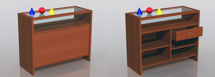 Mostrador tapa enradada, con cristal superior encastrado. Los estantes interiores son graduables en altura.