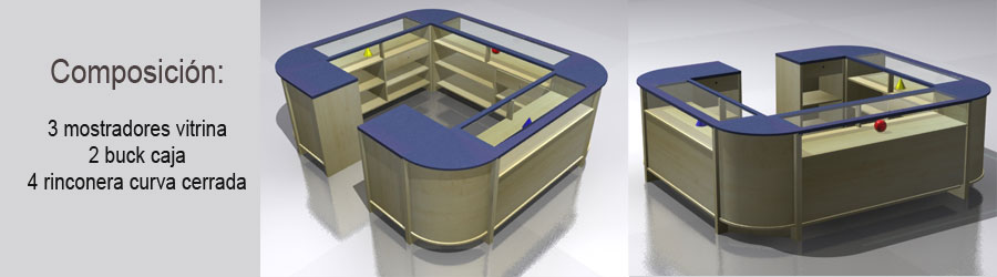 En este ejemplo utilizamos mostradores cerrados y vitrinas simples para exposición, y rinconeras curvas y rectas para cerrar.